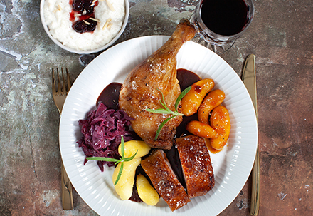 Hos mad med mere kan du bestille sprødstegt and og lækkert tilbehør: Rødkål, hvide og brunede aspargeskartofler samt en kraftig andesauce. Til dessert vil der være risalamande.